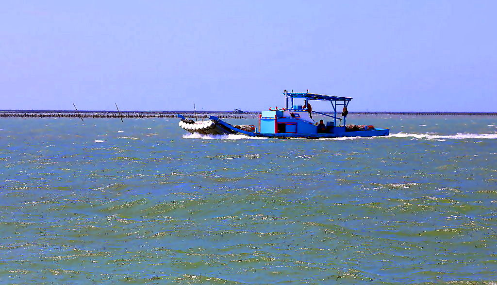 蚵農駕竹筏工作