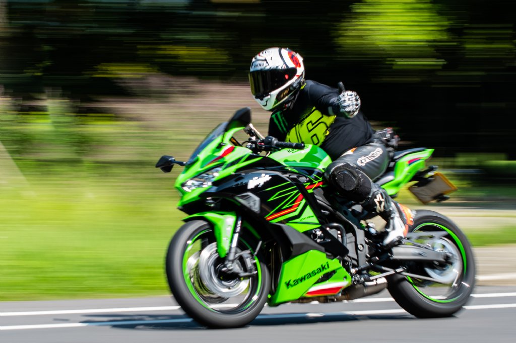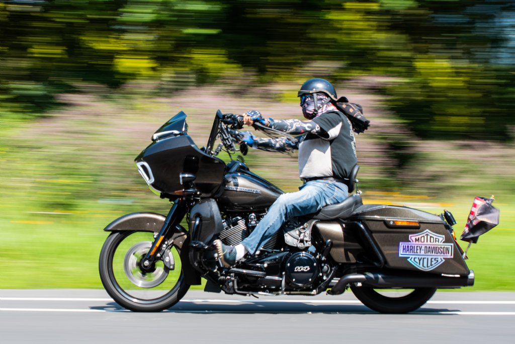 騎士駕駛重型機車,悠遊行駛浪漫台3線山間道路。