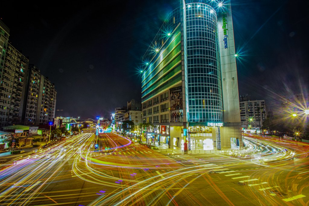 夜曝台中日曜天地OUTLET,每一條燈軌代表著回家的車潮。