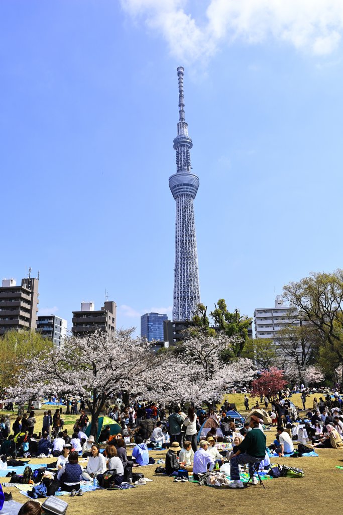 3月28日東京仍然放晴 早上前往隅田川堤兩旁櫻花樹 已經盛開了 同樣吸引不少遊客觀賞 尤其河堤下有一休閒公園 擠滿日本遊客 鋪滿草地 成群結隊 野餐 或坐或躺 享受溫暖陽光下櫻花美景 這裡離日本 出名晴空塔不遠 可清楚遠眺高處晴空塔 景色迷人