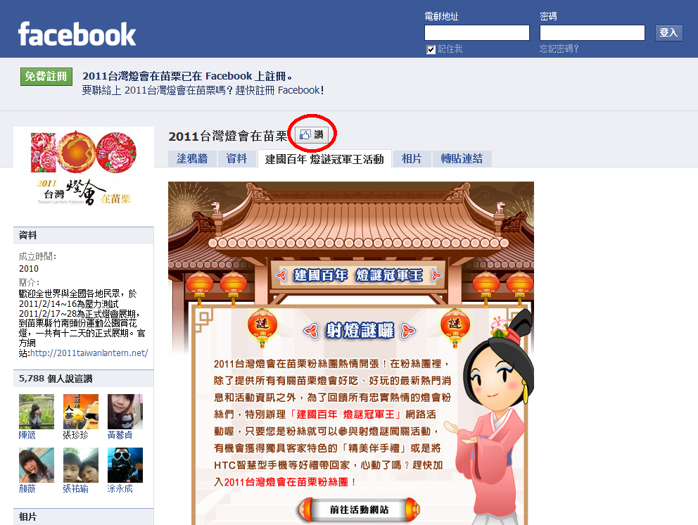 1. 登入您的facebook,於【2011臺灣燈會在苗栗】官方粉絲專頁(http://www.facebook.com/pages/2011台灣燈會在苗栗/103499886380678)按下『讚』的按鈕加入粉絲團。
